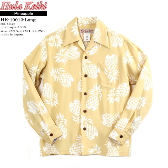 長袖アロハシャツ|フラケイキ ハワイアン(HULA KEIKI HAWAIIAN)|マカナレイ(MAKANALEI)の姉妹ブランド|HK-19001-L (19012-L)パイナップル(PINEAPPLE)|ベージュ|メンズ|レーヨン100%|開襟|フルオープン|長袖|アロハタワー(アロハシャツ販売)