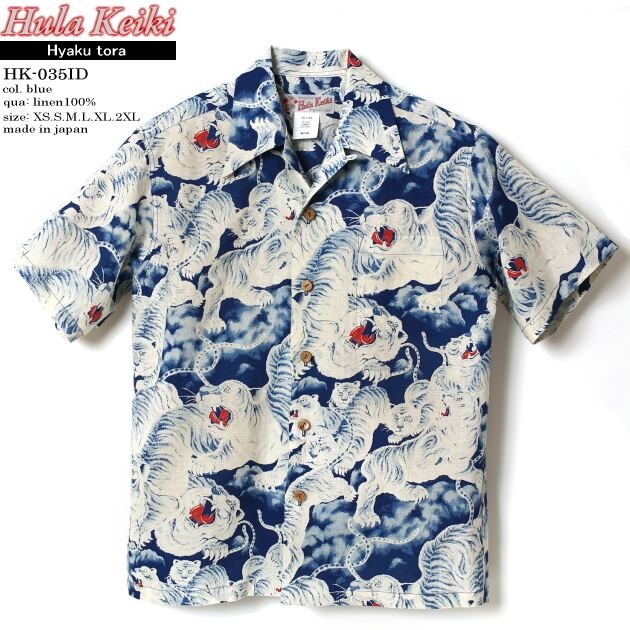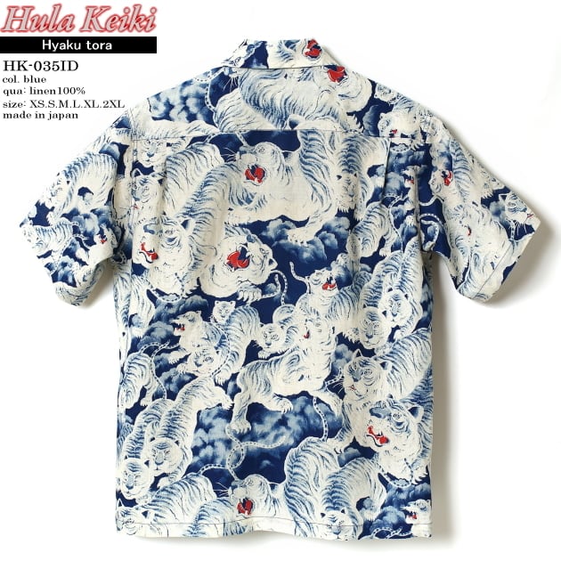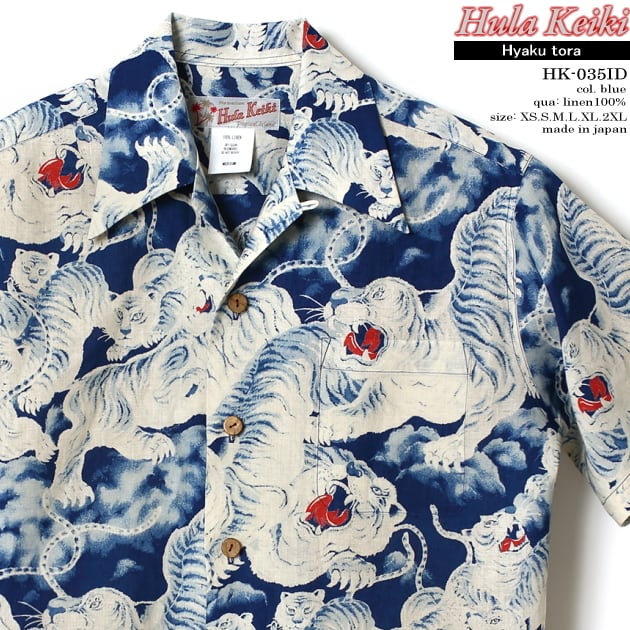 HULA KEIKI (フラケイキ) HK-035ID "インディゴ 百虎 indigo Hyaku-tora “ 素材は 高級リネン (麻) 100% です。<font size="2" color="red">このモデルのプリント技法はインディゴ抜染になります。</font>左胸のポケットは柄合わせされています。ボタンは天然素材のココナッツボタンを使用。 高級リネン (麻) 素材を使った HULA KEIKI (フラケイキ) アロハシャツは 最高の着心地です。