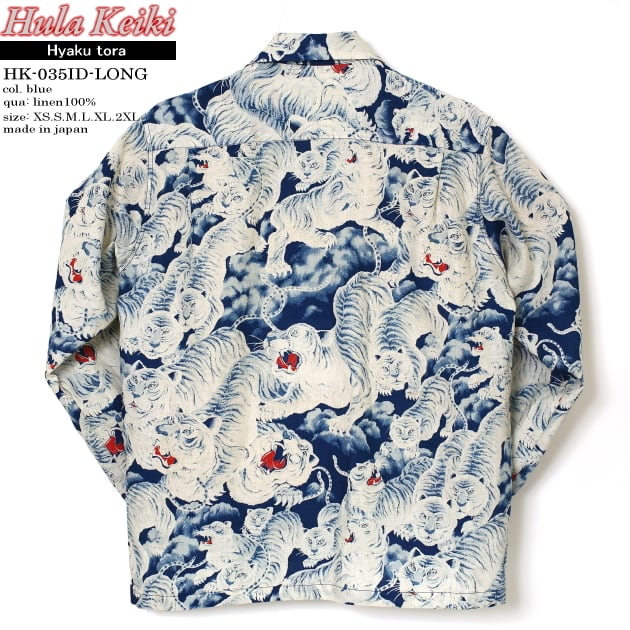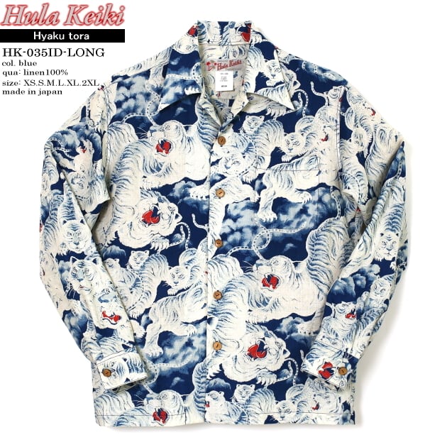 長袖アロハシャツ|フラケイキ ハワイアン(HULA KEIKI HAWAIIAN)|マカナレイ(MAKANALEI)の姉妹ブランド|HK-035ID-LONG 百虎(HYAKU TORA)|ブルー|インディゴ抜染|メンズ|リネン100%|開襟(オープンカラー)|フルオープン|長袖|アロハタワー(アロハシャツ販売)