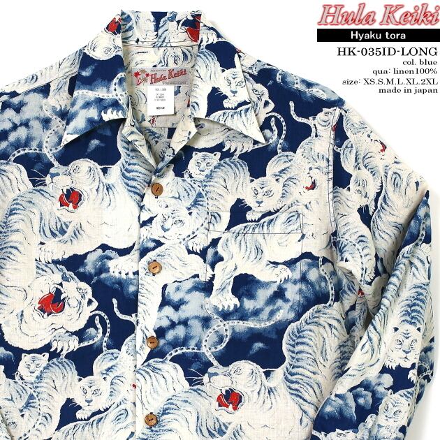 HULA KEIKI (フラケイキ) HK-035ID "インディゴ 百虎 indigo Hyaku-tora “ 素材は 高級リネン (麻) 100% です。<font size="2" color="red">このモデルのプリント技法はインディゴ抜染になります。</font>左胸のポケットは柄合わせされています。ボタンは天然素材のココナッツボタンを使用。 高級リネン (麻) 素材を使った HULA KEIKI (フラケイキ) アロハシャツは 最高の着心地です。