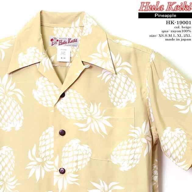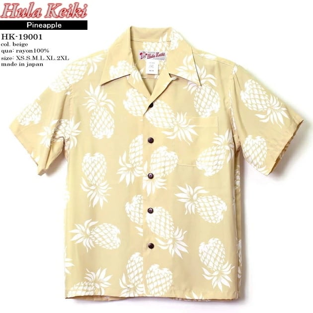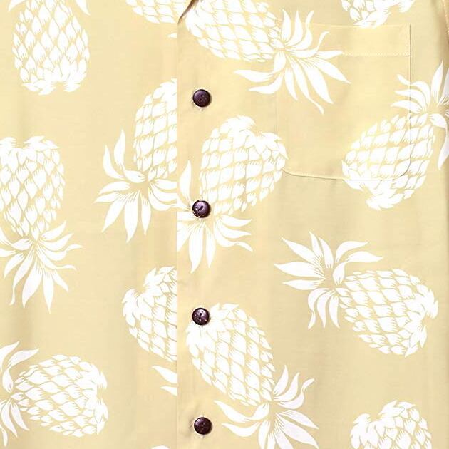 アロハシャツ|フラケイキ ハワイアン(HULA KEIKI HAWAIIAN)|マカナレイ(MAKANALEI)の姉妹ブランド|HK-19001 (19012)パイナップル(PINEAPPLE)|ベージュ|メンズ|レーヨン100%|開襟(オープンカラー)|フルオープン|半袖|アロハタワー(アロハシャツ販売)