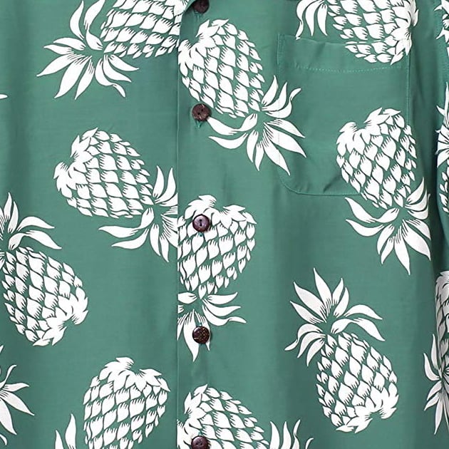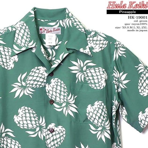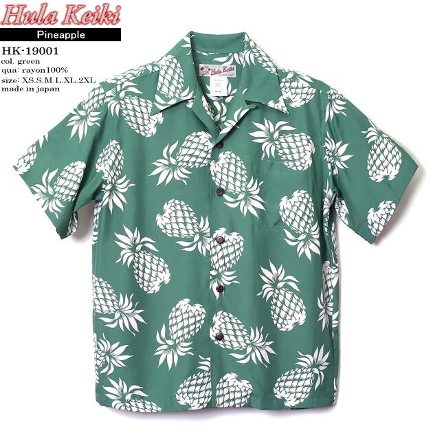 アロハシャツ|フラケイキ ハワイアン(HULA KEIKI HAWAIIAN)|マカナレイ(MAKANALEI)の姉妹ブランド|HK-19001 (19012)パイナップル(PINEAPPLE)|グリーン|メンズ|レーヨン100%|開襟(オープンカラー)|フルオープン|半袖|アロハタワー(アロハシャツ販売)