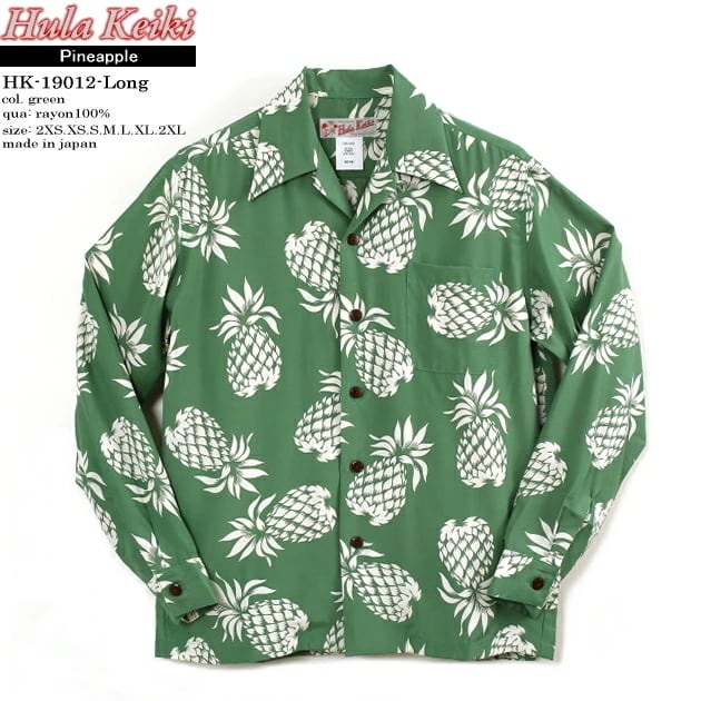 長袖アロハシャツ|フラケイキ ハワイアン(HULA KEIKI HAWAIIAN)|マカナレイ(MAKANALEI)の姉妹ブランド|HK-19001-L (19012-L)パイナップル(PINEAPPLE)|グリーン|メンズ|レーヨン100%|開襟|フルオープン|長袖|アロハタワー(アロハシャツ販売)