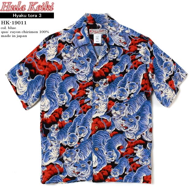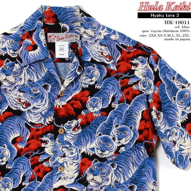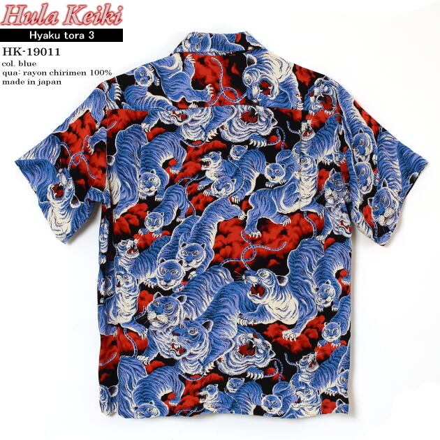 アロハシャツ|フラケイキ ハワイアン(HULA KEIKI HAWAIIAN)|マカナレイ(MAKANALEI)の姉妹ブランド|HK-19011 百虎3(HYAKU TORA)|ブラック/ロイヤル|メンズ|レーヨン チリメン100%|開襟|フルオープン|半袖|アロハタワー(アロハシャツ販売)