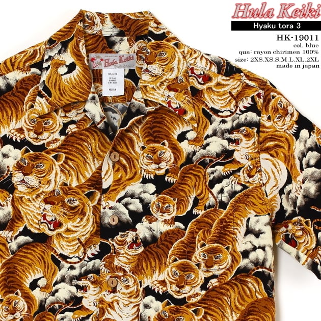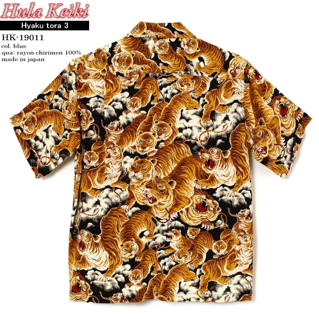 和柄アロハファンだけでなく、アロハシャツ好きならいわずと知れた百虎。和柄アロハの最高傑作のひとつでもある通称「百虎」は、シャツの身頃一杯に迫力のある虎の群れが描かれています。正式名称は定かではないですが、メーカー呼称は「1000 Tigers」などど呼ばれ、カラカウア(KALA KAUA)が世に送り出した最初のブランドとされています。ヴィンテージ市場で最も人気の高い和柄のハワイアンシャツ"THE HUNDRED TIGERS"を国内ブランドのフラケイキハワイアンが再現しました。