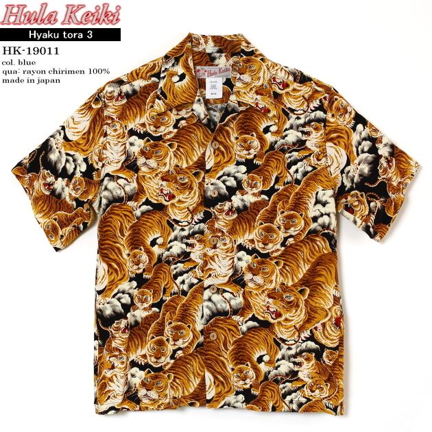 アロハシャツ|フラケイキ ハワイアン(HULA KEIKI HAWAIIAN)|マカナレイ(MAKANALEI)の姉妹ブランド|HK-19011 百虎3(HYAKU TORA)|ブラック/ゴールド|メンズ|レーヨン チリメン100%|開襟|フルオープン|半袖|アロハタワー(アロハシャツ販売)