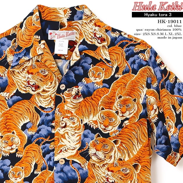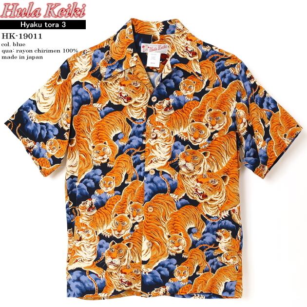 アロハシャツ|フラケイキ ハワイアン(HULA KEIKI HAWAIIAN)|マカナレイ(MAKANALEI)の姉妹ブランド|HK-19011 百虎3(HYAKU TORA)|ブルー|メンズ|レーヨン チリメン100%|開襟(オープンカラー)|フルオープン|半袖|アロハタワー(アロハシャツ販売)