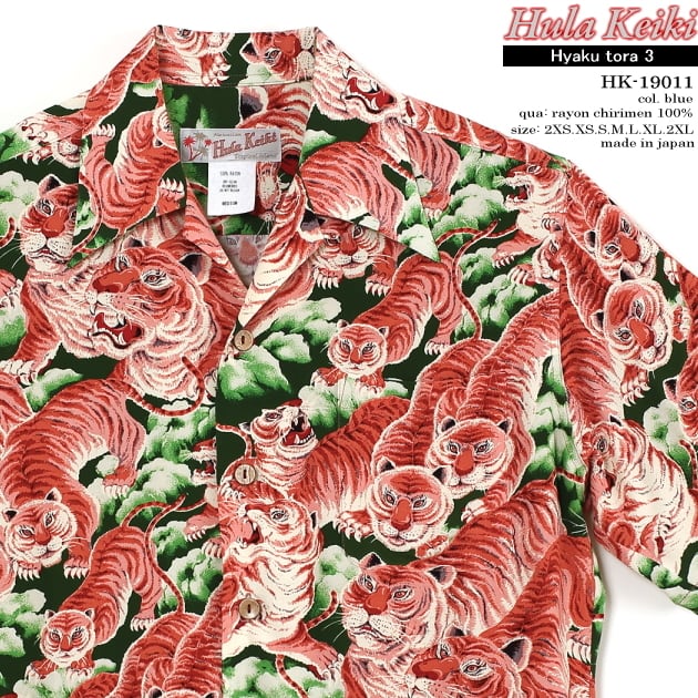 和柄アロハファンだけでなく、アロハシャツ好きならいわずと知れた百虎。和柄アロハの最高傑作のひとつでもある通称「百虎」は、シャツの身頃一杯に迫力のある虎の群れが描かれています。正式名称は定かではないですが、メーカー呼称は「1000 Tigers」などど呼ばれ、カラカウア(KALA KAUA)が世に送り出した最初のブランドとされています。ヴィンテージ市場で最も人気の高い和柄のハワイアンシャツ"THE HUNDRED TIGERS"を国内ブランドのフラケイキハワイアンが再現しました。