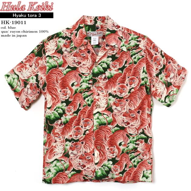 アロハシャツ|フラケイキ ハワイアン(HULA KEIKI HAWAIIAN)|マカナレイ(MAKANALEI)の姉妹ブランド|HK-19011 百虎3(HYAKU TORA)|グリーン|メンズ|レーヨン チリメン100%|開襟(オープンカラー)|フルオープン|半袖|アロハタワー(アロハシャツ販売)