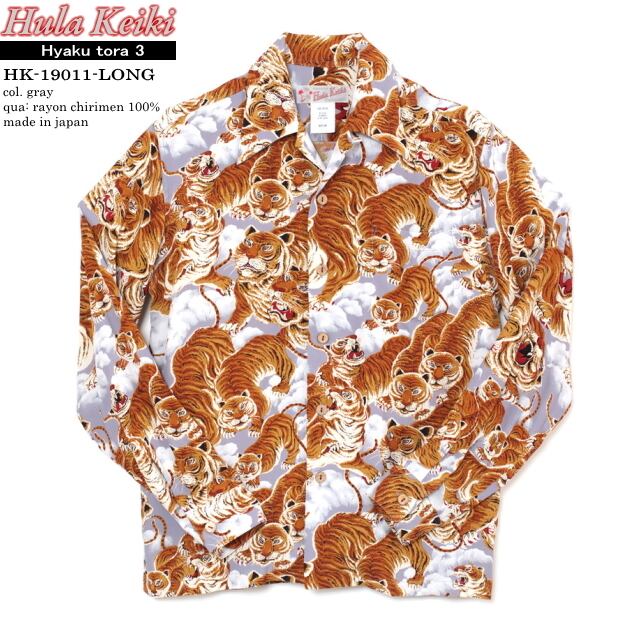 長袖アロハシャツ|フラケイキ ハワイアン(HULA KEIKI HAWAIIAN)|マカナレイ(MAKANALEI)の姉妹ブランド|HK-19011 百虎3(HYAKU TORA)|グレイ|メンズ|レーヨン チリメン100%|開襟(オープンカラー)|フルオープン|長袖|アロハタワー(アロハシャツ販売)