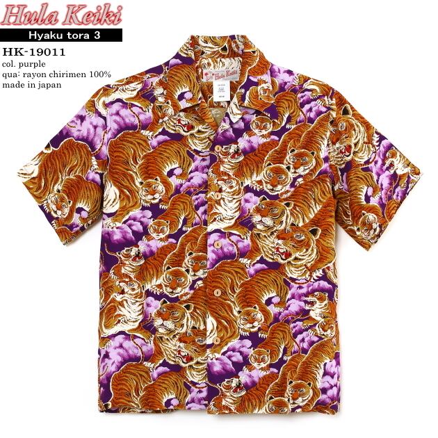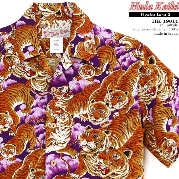 アロハシャツ|フラケイキ ハワイアン(HULA KEIKI HAWAIIAN)|マカナレイ(MAKANALEI)の姉妹ブランド|HK-19011 百虎3(HYAKU TORA)|パープル|メンズ|レーヨン チリメン100%|開襟(オープンカラー)|フルオープン|半袖|アロハタワー(アロハシャツ販売)