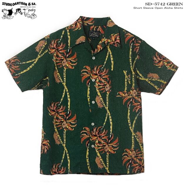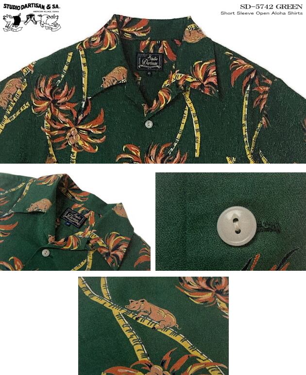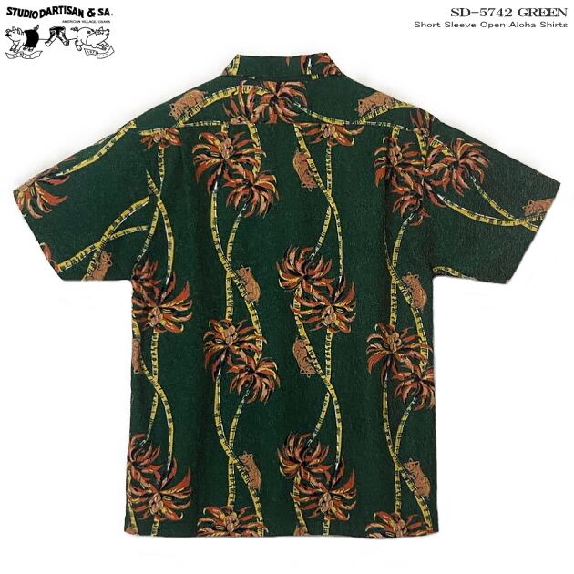 【サイズ:S~2XL】アロハシャツ|ステュディオ・ダ・ルチザン(STUDIO D'ARTISAN)|豚アロハ ダルチ SD-5742 |PALM CLIMBER(パームクライマー)豚バージョン|グリーン|コットン(綿)100%|開襟|メンズ| 日本製|フルオープン|半袖|アロハタワー(アロハシャツ販売) 2026年春夏モデル新作<半袖> 大人の遊び着 アロハシャツ